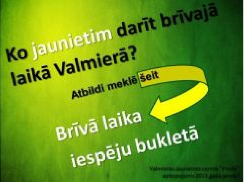 Valmieras pilsētā jauniešiem vecumā no 13 līdz 25 gadiem ir pieejamas plašas iespējas kā patīkami un lietderīgi pavadīt savu brīvo laiku. Piedāvājumu sniedz interešu centri, izglītības iestādes, aktīvi darbojās nevalstiskās un sporta organizācijas, pašdarbības kolektīvi, kā arī jaunieši var veikt brīvprātīgo darbu. Bukleta mērķis ir dot iespēju jauniešiem vienuviet atrast informāciju par brīvā laika pavadīšanas iespējām, mudināt izmantot plašo un dažādo piedāvājumu, lai uzlabotu savas prasmes un zināšanas, kas noderēs nākotnē, kā arī jautri pavadītu laiku.